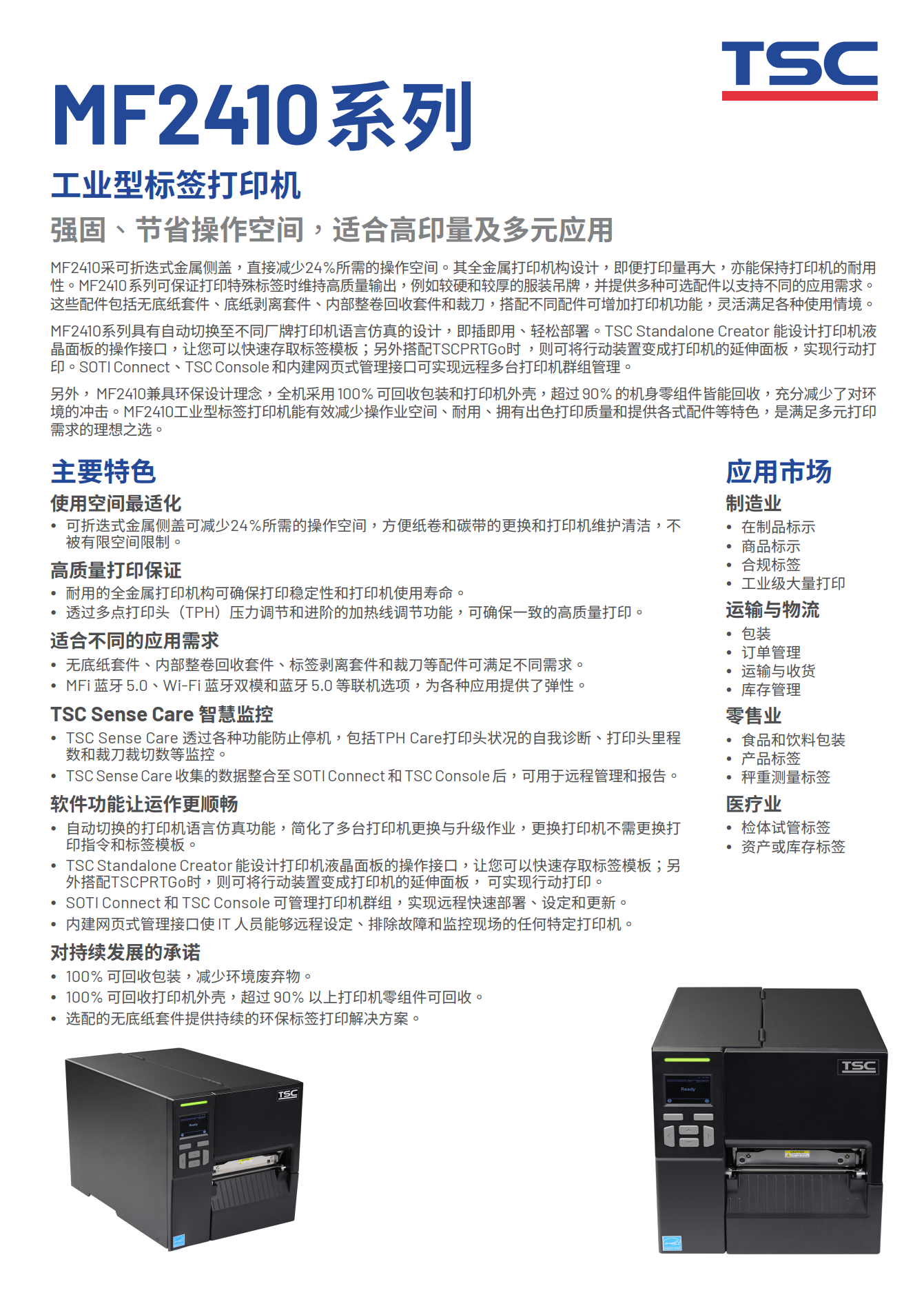 MF 系列4英吋宽工业型标签打印机,为同级产品的价值领导者。其全金属打印机构设计,即便打印量再大,亦能保持打印机的耐用性。MF 系列可保证打印特殊标签时维持高质量输出,例如较硬和较厚的服装吊牌,并提供多种可选配件以支持不同的应用需求。这些配件包括无底纸套件、底纸剥离套件、内部整卷回收套件和裁刀,搭配不同配件可增加打印机功能,灵活满足各种使用情境。 MF 系列工业型标签打印机除了耐用设计,同时拥有出色打印质量和提供各式配件等特色,是满足多元打印需求的理想之选。