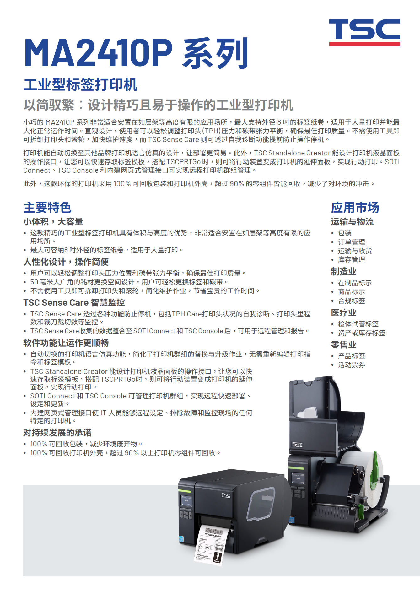 MA系列为设计精巧且易于操作的工业型打印机。拥有直观设计,使用者可以轻松调整打印头 (TPH) 压力和碳带张力平衡,确保最佳打印质量。不需使用工具即可拆卸打印头和滚轮,加快维护速度,而 TSC Sense Care 则可透过自我诊断功能提前防止停机。